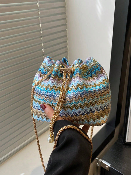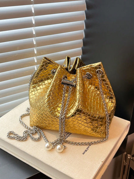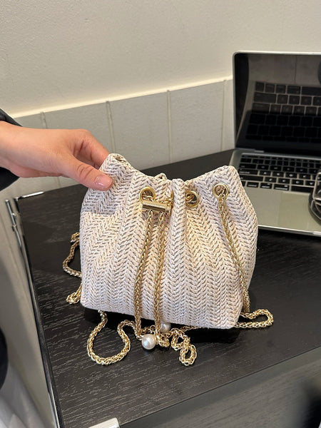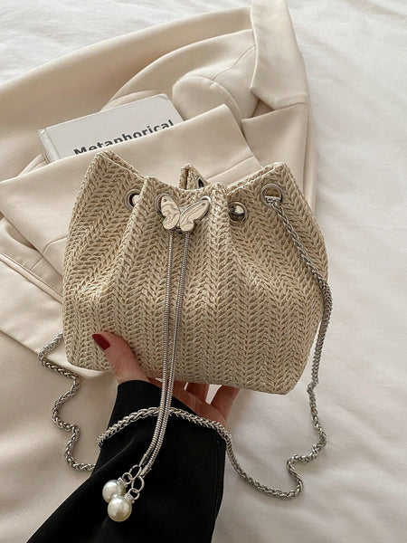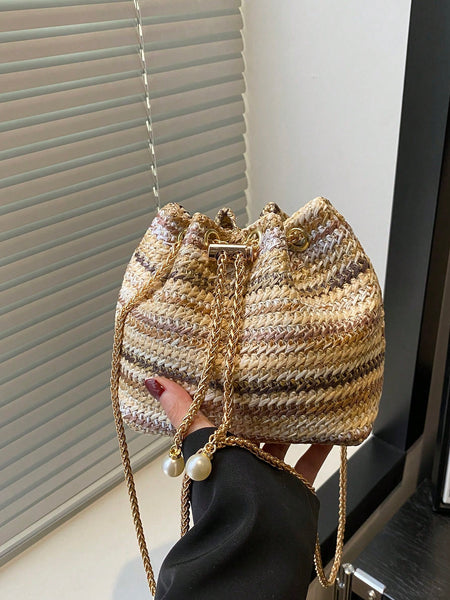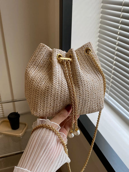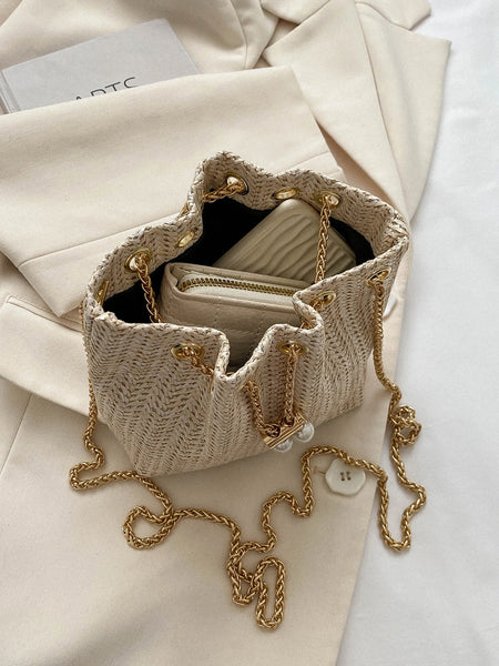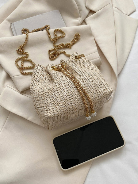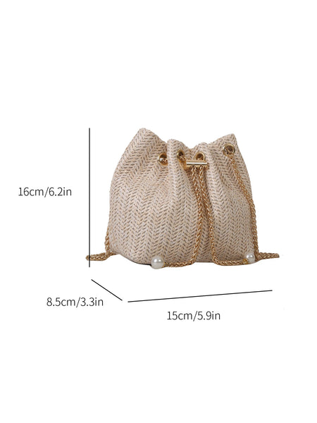 Tipo de Estampado : Estampado Integral Ocasión : Oficina Detalles : Cruzado Estilo : Casual Color : Beis Tipo de tirantes : Ajustable Tipo de cierre : Cremallera Talla del bolso : Pequeño Tipo : Bolsa cubo Composición : 100% Poliéster Material : Poliéster