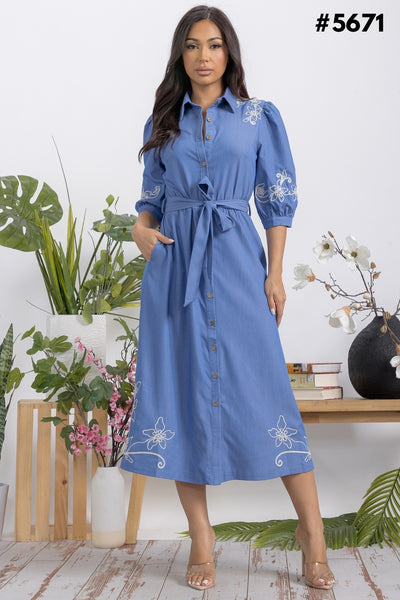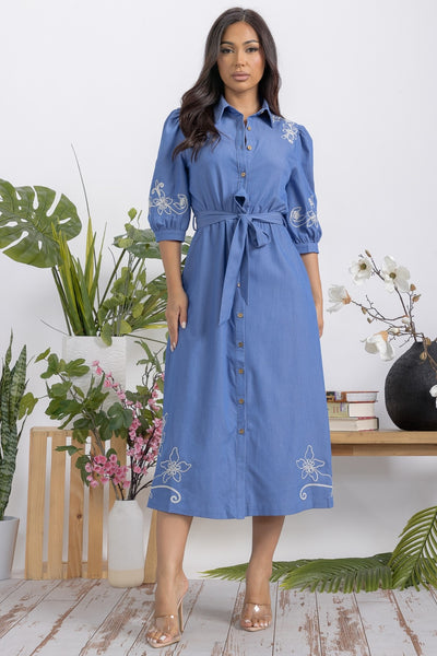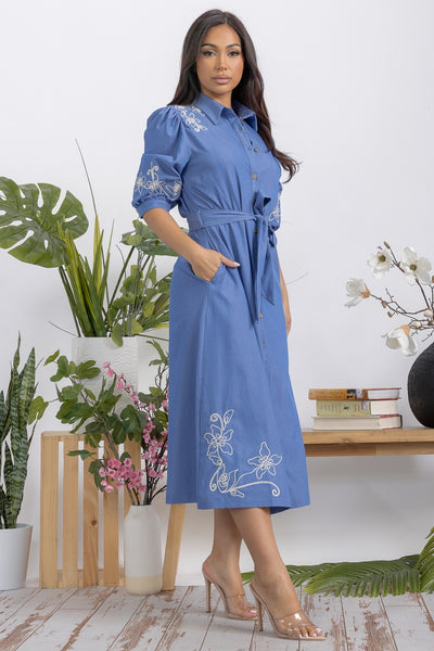 Embroidery Button Down Denim Midi Dress