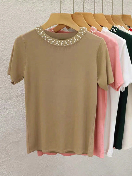 Corte del bajo : NormalForro : Sin ForroForrado Para Aportar Calidez : NoTipos de Manga : Manga normalTipo de Estampado : LisoColor : CaquiDetalles : Perlas, Cuentas, Diamante de imitaciónEstilo : CasualEscote : cuello redondoLongitud de la Manga : manga cortaLongitud : NormalTipo de ajuste : RegularTejido : Elástico LigeroMaterial : PoliésterComposición : 95% Poliéster, 5% ElastanoInstrucciones de Cuidado : Lavado a mano o limpieza en seco profesionalTransparente : No