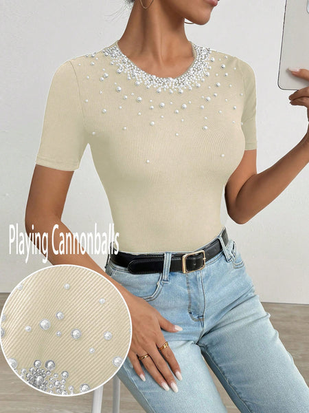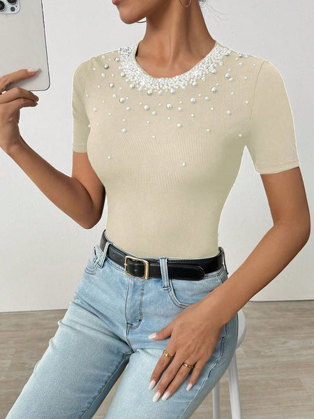 Corte del bajo : NormalForro : Sin ForroForrado Para Aportar Calidez : NoTipos de Manga : Manga normalTipo de Estampado : Color combinado, Geométrico, Liso, Estampado IntegralColor : AlbaricoqueDetalles : PerlasEstilo : CasualEscote : cuello redondoLongitud de la Manga : manga cortaLongitud : NormalTipo de ajuste : AjustadoTejido : Estiramiento medioMaterial : Tela tricotadaComposición : 95% Poliéster, 5% ElastanoInstrucciones de Cuidado : Lavadora, no limpiar en secoTransparente : No