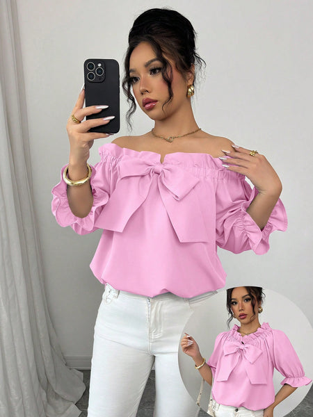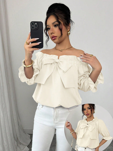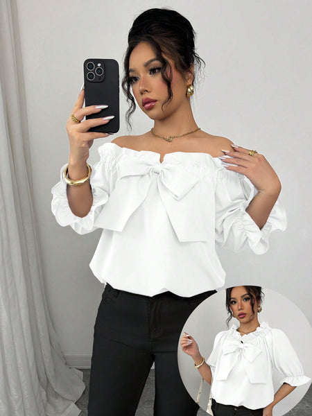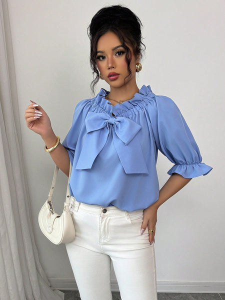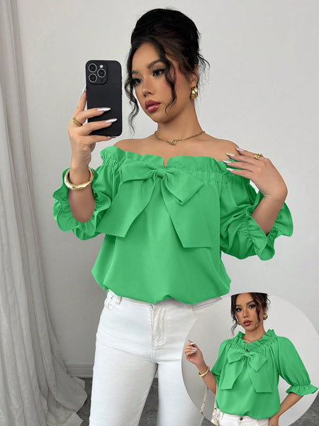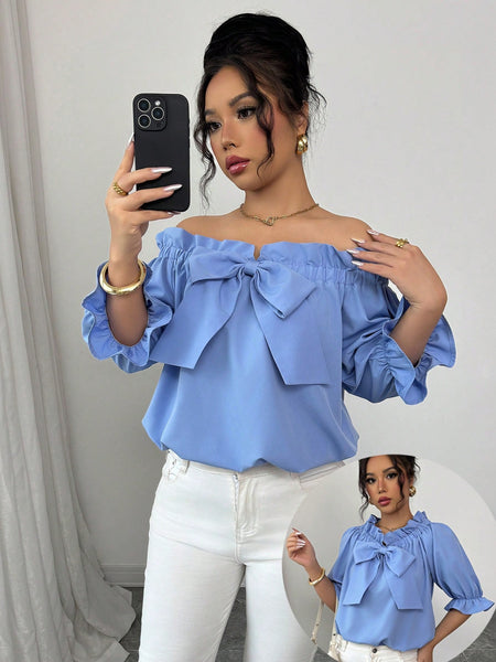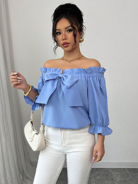 Forro : Sin ForroForrado Para Aportar Calidez : NoTipo : TopTipo de Estampado : LisoEstilo : CasualDetalles : Volante, Capas relajadas, LazoColor : AzulCorte del bajo : NormalTipos de Manga : Manga con volanteEscote : Hombros descubiertosLongitud de la Manga : manga francesaLongitud : NormalTipo de ajuste : RegularTejido : No-ElásticoMaterial : PoliésterComposición : 95% Poliéster, 5% ElastanoInstrucciones de Cuidado : lavadora o limpieza en seco profesionalTransparente : No