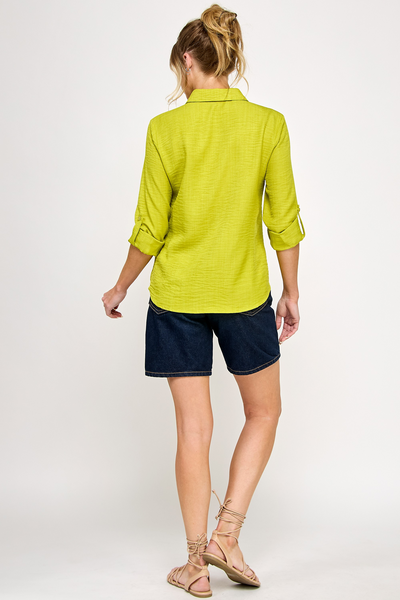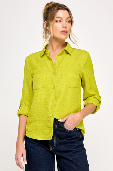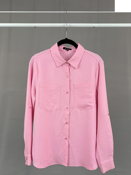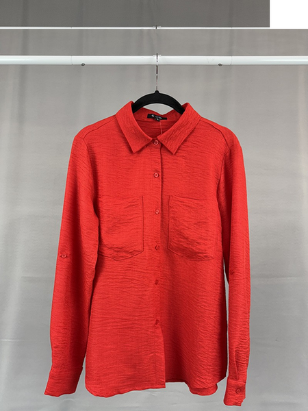 Blusa de manga larga con botones y bolsillo de parche (100 % poliéster), fabricada en China.