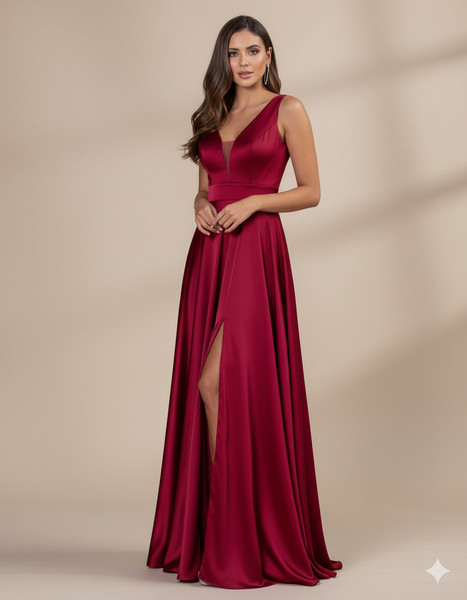 En satén brillante, este vestido de fiesta largo de corte A es tan hermoso como clásico. Con un estilo sofisticado para fiestas de graduación, bodas y otros eventos formales, este elegante vestido de noche con cuello en V es simplemente precioso. Además de una transparencia en el pronunciado escote en V, este brillante vestido formal largo tiene tirantes que terminan en la espalda en V. Una banda ancha realza la cintura y corona la romántica falda de corte A con una abertura lateral.