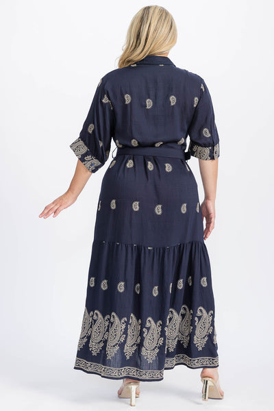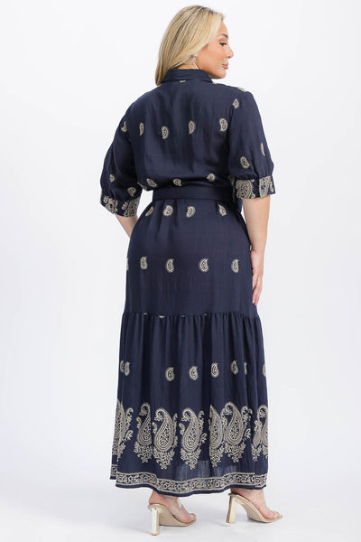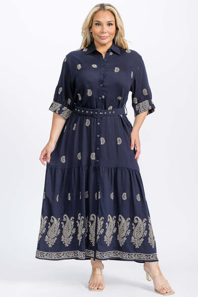 Vestido largo, talla extra, bottones, mangas 3/4, bordado, tela de lino, con cinto.