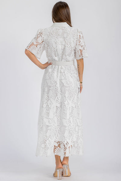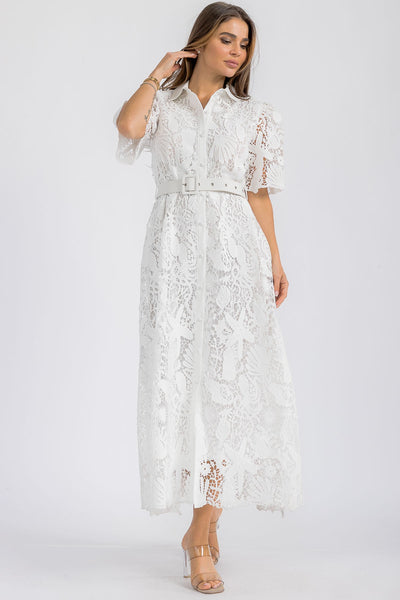 Vestido maxi de encaje . forrado, cinto incluido, de botones al frente model size 5.9" dress 2 32C - 24 - 36