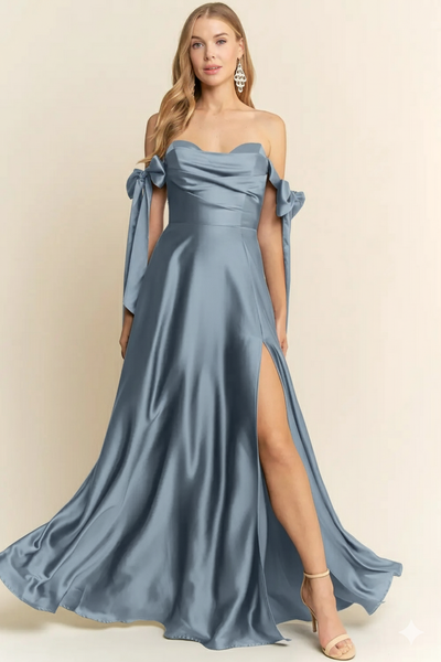 - VESTIDO DE NOCHE Y DE DAMAS DE HONOR DE SATÉN - HOMBROS DESCUBIERTOS - TIRAS AJUSTABLES - ESCOTE CORAZÓN - VESTIDO MAXI FLUIDO DE CORTE A - ABERTURA EN LA PIERNA - CIERRE DE CREMALLERA EN LA ESPALDA 100% POLIÉSTER IMPORTADO