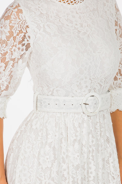 Vestido largo Missy de color liso con encaje, cuello redondo, cinturón, manga tres cuartos, cremallera en la espalda y forro interior. La modelo mide 1,70 m, tiene unas medidas de 86-66-107 cm y lleva la talla S.